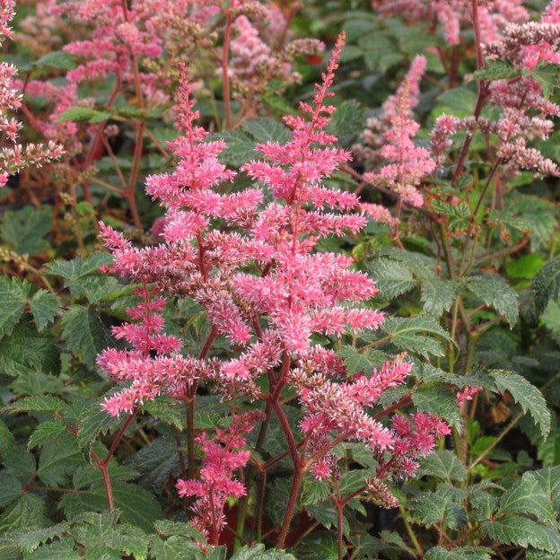 One of the longest blooming Astilbe, 'Key Largo' boasts slightly fragrant raspberry pink flowers on red stems. The green foliage darkens as it ages and looks good even without flowers. Expect blooms from mid to late summer.