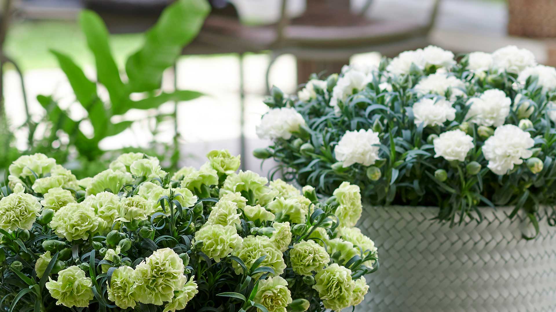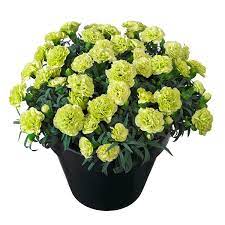 Also known as a "Carnation" this variety of Dianthus features large, double, pale yellow-green blooms and silver-blue foliage with lengthy blooming periods. Blooms are often two inches in diameter on top of sturdy stems. Dianthus makes a great cut flower, and is ideal for containers, garden borders, and modern landscapes. A cottage garden is not complete without several Dianthus.