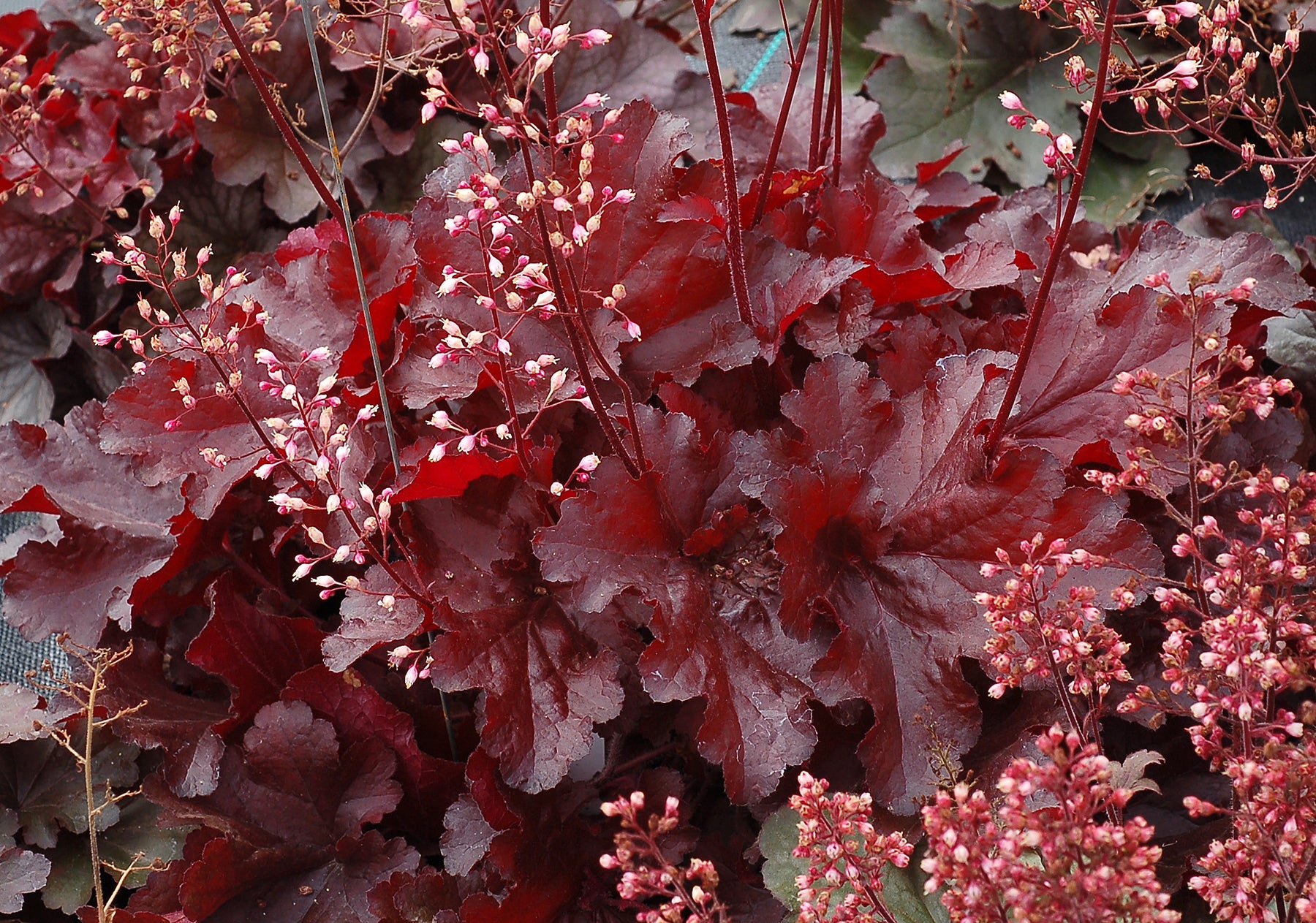 Brilliant, saturated, burgundy-red ruffled foliage remains consistent in color but produces its deepest red hues in the spring and fall. Red stems that echo the foliage color support creamy-white flowers that open from pink buds.