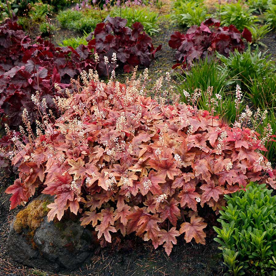 This Hecherella features brassy gold and red spring color on maple-shaped leaves and spikes of white flowers on dark stems. In the Winter the color shifts to olive and brown.