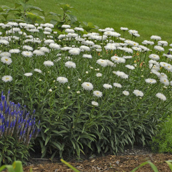 'Crazy Daisy' produces multiple flowers per stem reaching 2-2.5' tall with approximately 2.5" blooms. Lance-shaped, medium green leaves (basal leaves to 12” long). Blooms most of the summer.