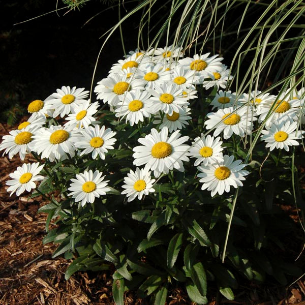 'Snow lady' is long a wonderful compact, dwarf Shasta Daisy which produces 2.5" diameter flower heads with crisp white petals and yellow centers, on coarsely-toothed, shaped medium leaves. Stems do not require staking and blooms last into the hot summer months.