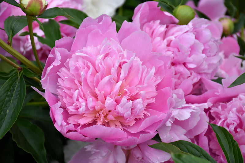 Paeonia lactiflora ''Heidi' Peonies are a group of herbaceous perennials that are widely known for their massive blooms. Their flowers appear in May and last through early June. Most flowers are large- over 4" across and up to 12" across in some varieties. Flowers are usually double and frilly and bloom in shades of pink, red, orange and white. Peonies have been bred and cultivated for hundreds of years. Because of this, they are extremely long-lived plants and can live and thrive for generations. There are peonies in existence that are over 100 years old. Peonies take a year or so to get established, and once they do, you can expect slight growth yearly with more prolific and larger blooms over time. They are a true garden investment. Plant peonies in full sun in slightly alkaline, well draining soil. Do not divide or dig you peonies- once they are planted, they should remain whole in the same spot. Water heavily when planted. Peonies need little maintenance and do not typically require fertilizer or amending soil. 'Heidi' is a double-flower, Japanese-style variety that features medium-sized double flowers in pink.