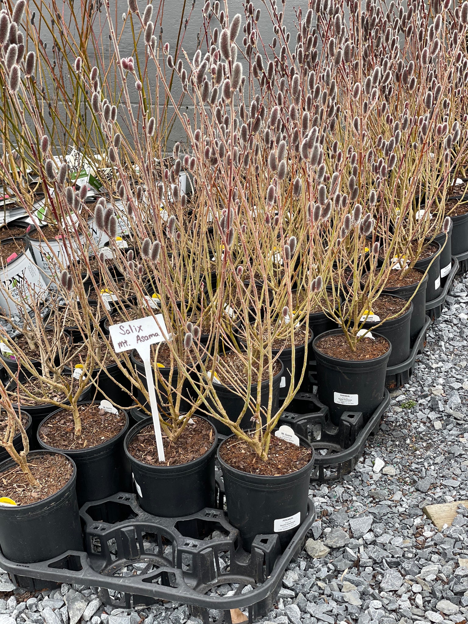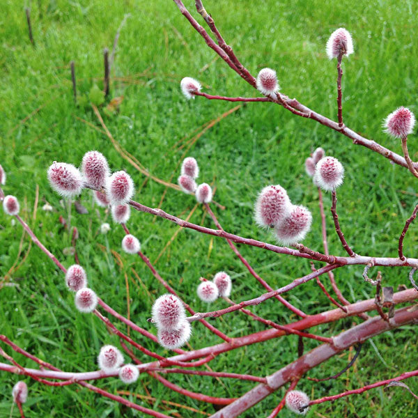 Mt. Asama Pink Flowering Willow. Popular for its "pink-tinged pussy willow flower heads. Buds emerge in late winter to early spring with a two-toned, dark burgundy and silver, before aging to black-silver. Named after the volcano Mt. Asama, it has larger catkins than the common pussy willow, Salix caprea." Prune back after flowering in the spring to induce more and longer stems that will flower the following spring. Plant in full sun where it will make a multi-stemmed shrub 8-10 ft. high.