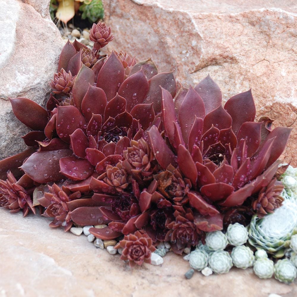 Commonly known as Hens-and-chicks, it is one of the most familiar and easiest to grow perennials. Fleshy leaves form a low clump with "babies" forming around the mother in the center. 'Chocolate Kiss' has dark red-brown rosettes. Pink flowers arrive in summer.