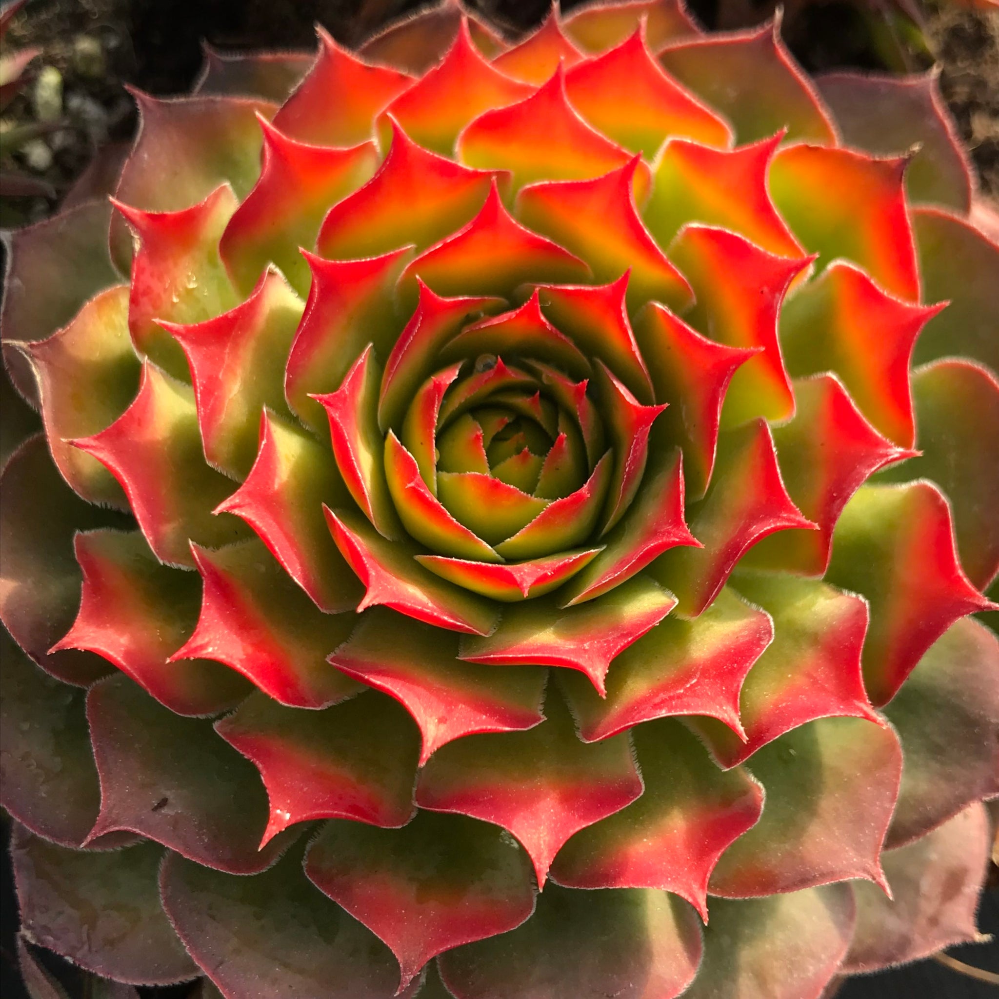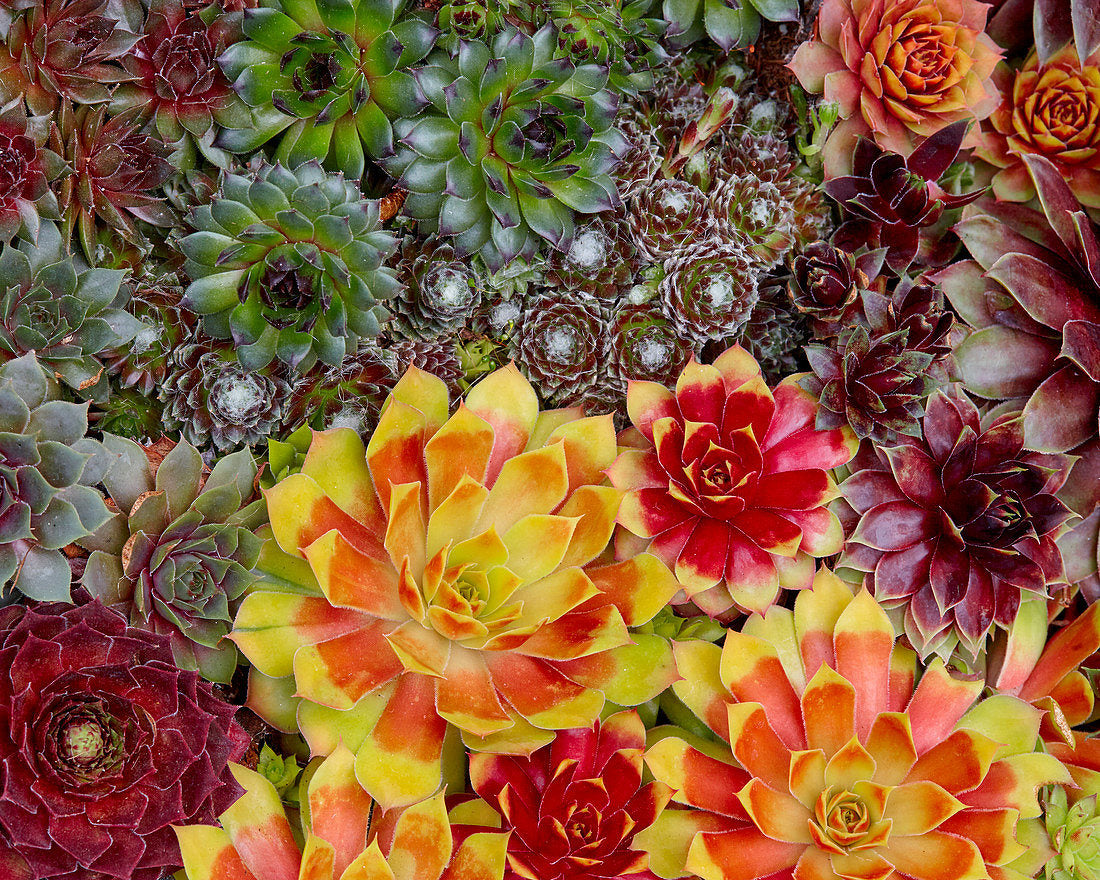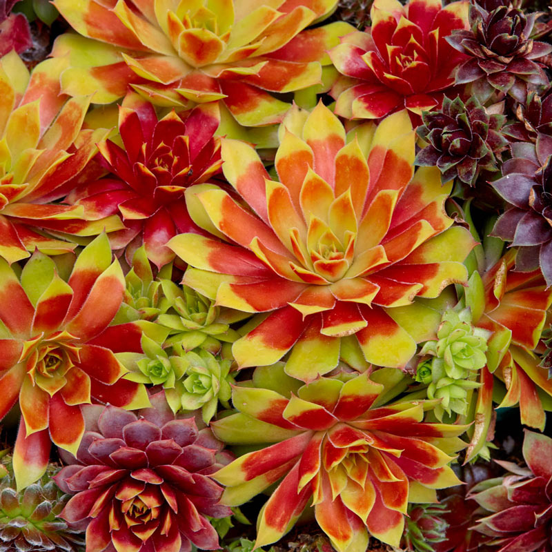 Commonly known as Hens-and-chicks, it is one of the most familiar and easiest to grow perennials. Fleshy leaves form a low clump with "babies" forming around the mother in the center. 'Gold Nugget' has vibrant red, hot pink and gold toned rosettes. Color intensifies as the weather gets cooler in fall. Pink flowers arrive in summer.