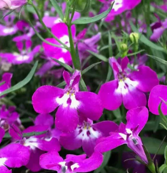 Annual lobelia is noted for is density, you can expect carpets of bright blooms beginning in spring and lasting through summer. Riviera Rose is an early bloomer with vibrant magenta-pink flowers with a white eye. Lobelia is an excellent performer when placed in hanging baskets, or used as a spiller in containers. Prefers part sun.