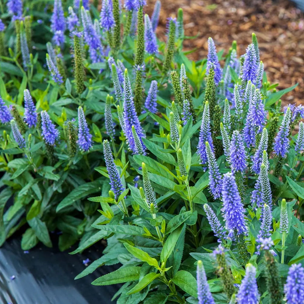 Commonly known as Speedwell, this semi-evergreen perennial is a good balance of small-medium size, bright-blue flower spikes. Neat tidy plants have glossy foliage and will fill in without overpowering. Expect blooms beginning in mid-late spring, is very long-blooming, and mildew resistant.