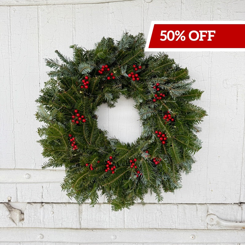 This 22" Fraser fir wreath is adorned with bright read weatherproof berries and includes a FREE strand of LED lights! Enjoy brilliant color all season long and warm light at night with this Black Friday special wreath.