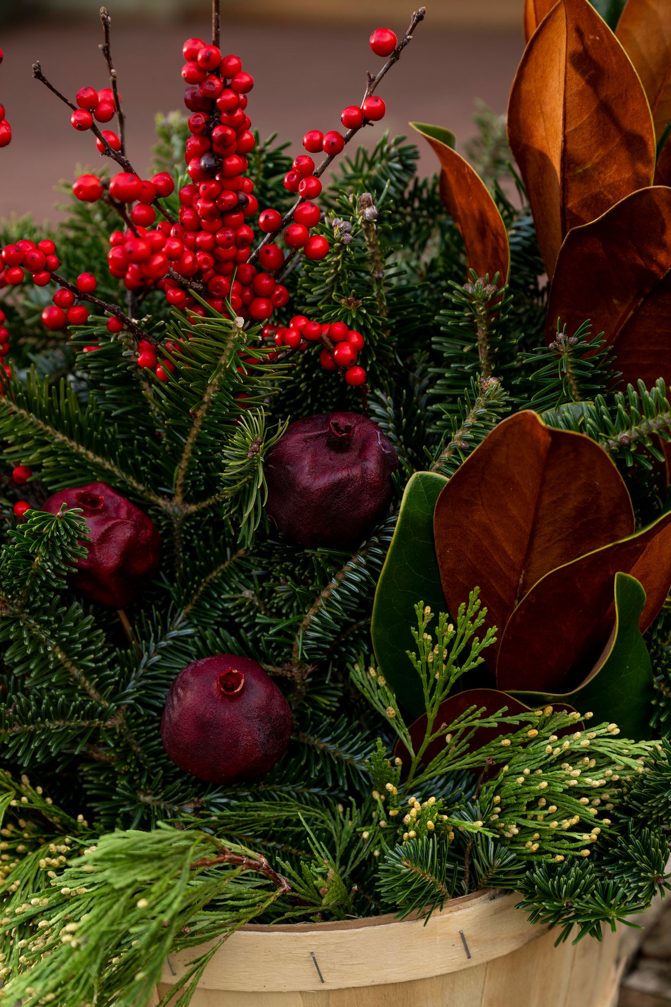 This bushel basket is planted full with fresh wintergreens and holiday adornments, and is ready to gift or place on your porch for instant holiday cheer.