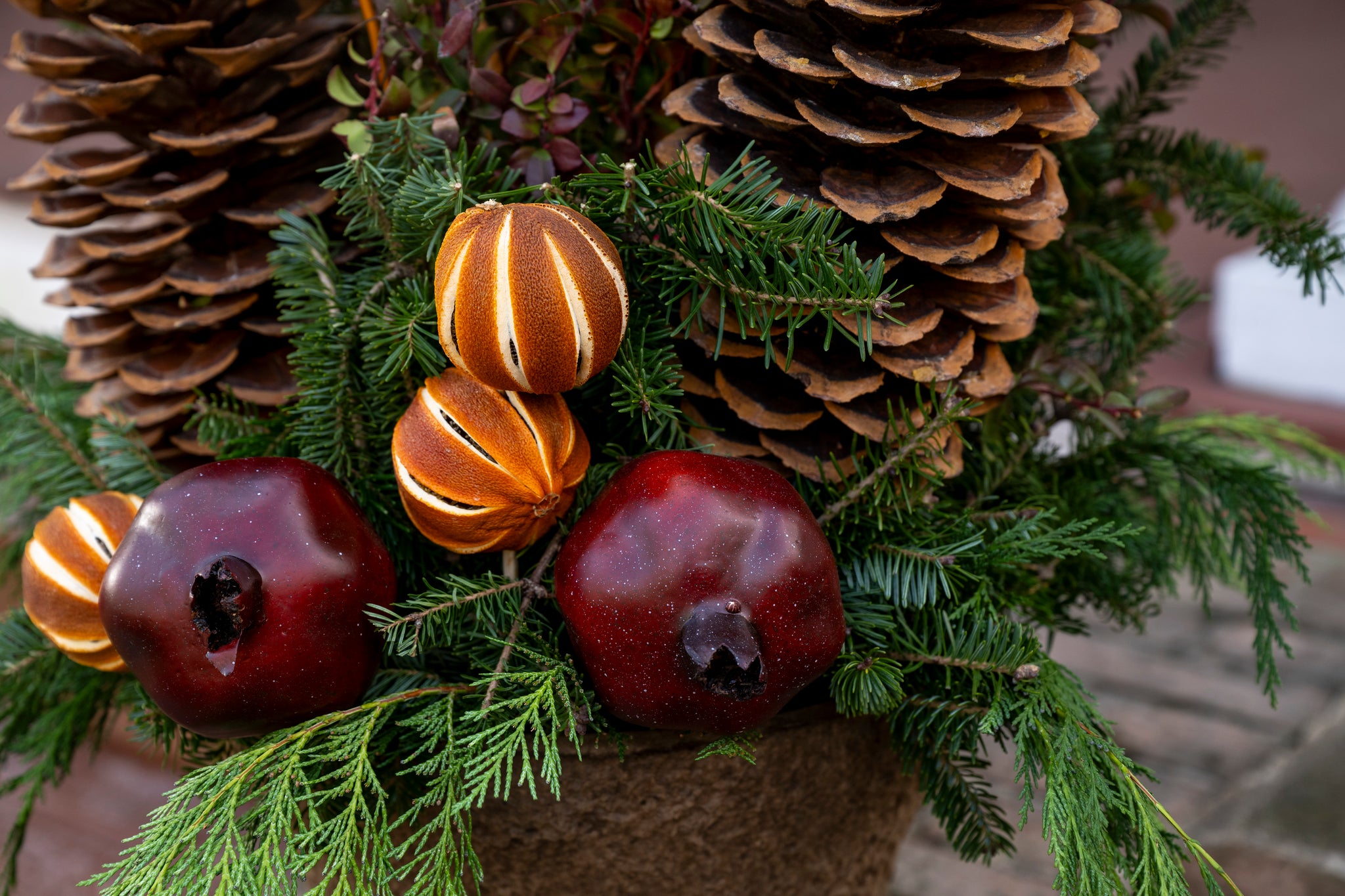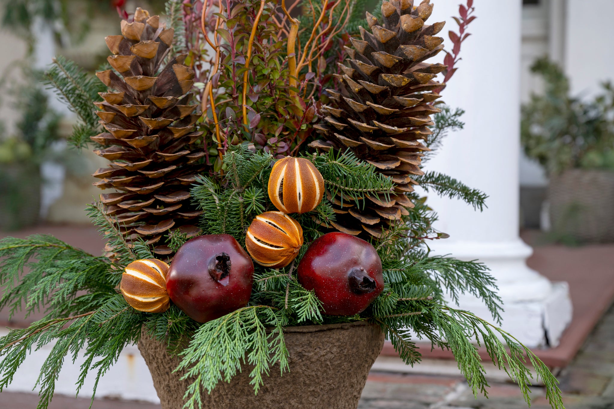 A true nod to historic Williamsburg, this fully planted drop-in biodegradable planter is filled with fresh wintergreens, dried oranges, pomegranates, sugar cones, red huckleberry and curly willow. It's sure to impress!