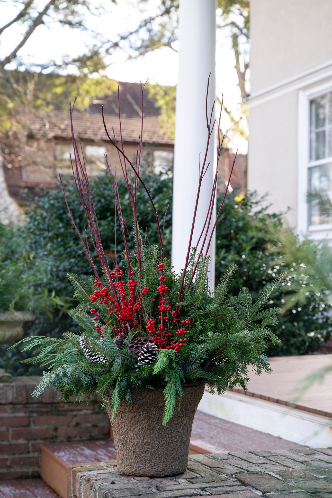 Our drop-in planters are fully completed and ready to either ‘drop in’ to your planters, or can be set on your porch as-is for instant holiday cheer. Greens and branches are arranged into a 12”x12” compressed pulp pot that will last for seasons either inside your own planter, or sitting directly on your porch or deck. All you need to do is water it a few times throughout the season for greens that will last until spring.